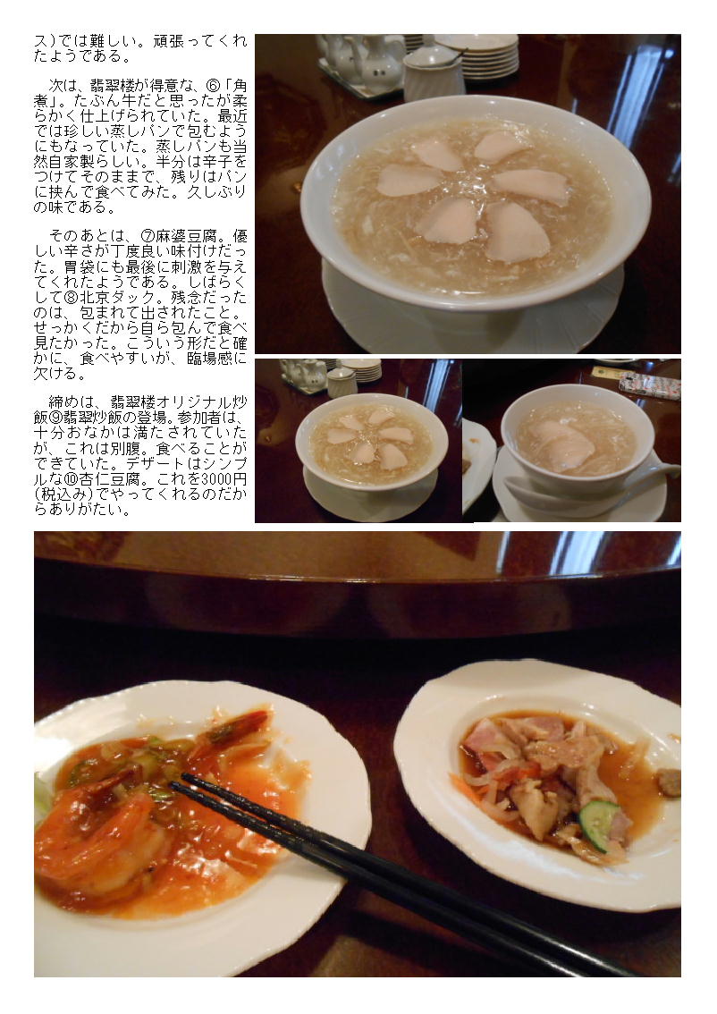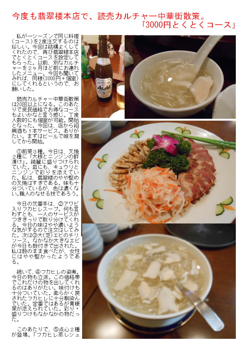 私が一シーズンで同じ料理(コース)を2度注文するのは珍しい。今回は結構よくしてくれたので、再び翡翠楼本店でとくとくコースを設定してもらった。以前、別なカルチャーを2ヶ月ほど前にお連れしたメニュー。今回も聞いてみれば、同様(3000円+個室)にしてくれるというので、お願いした。