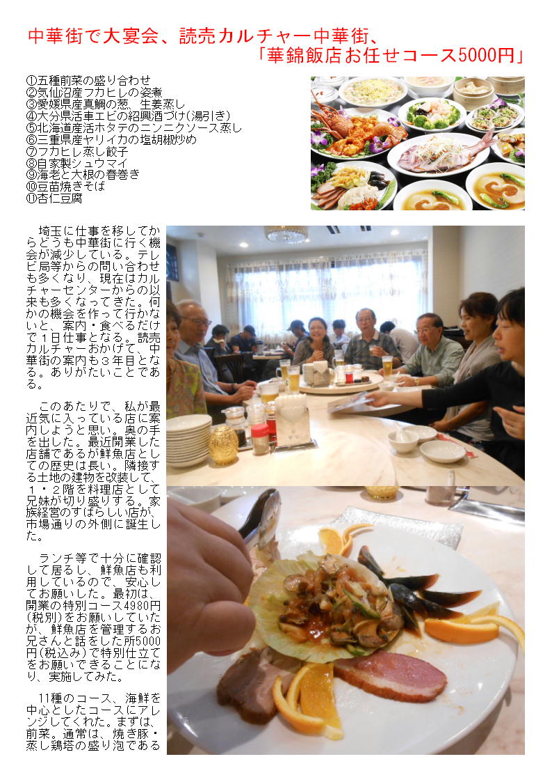 中華街で大宴会、読売カルチャー中華街、「華錦飯店お任せコース5000円」 200150915