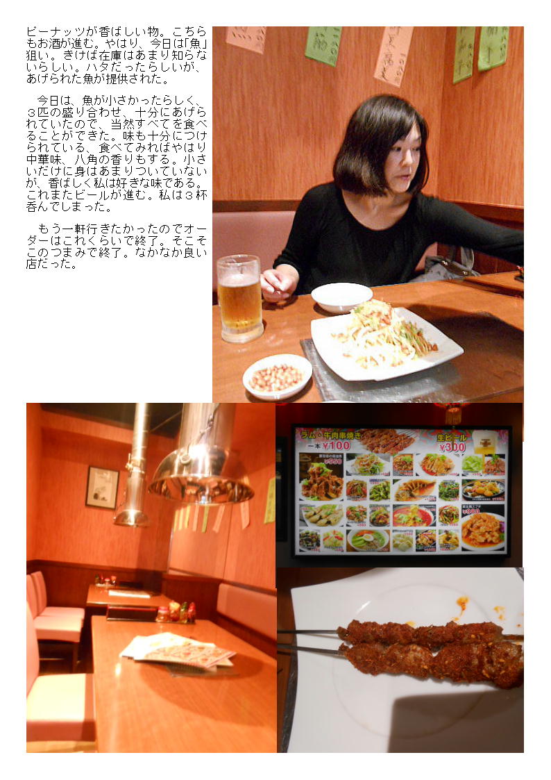 メニューは多彩。東北地方料理の「羊肉の串焼き」もある。当然、お連れした方々はこんな物食べたことはない頼んでみた。細身ではあるが、食べれば羊肉。最近数店舗で出されることが多いが、辛み(唐辛子)もつけられスパイシー。非常に美味しい。ビールが進む。ビールも300円/杯、続けざまに呑んでしまう。