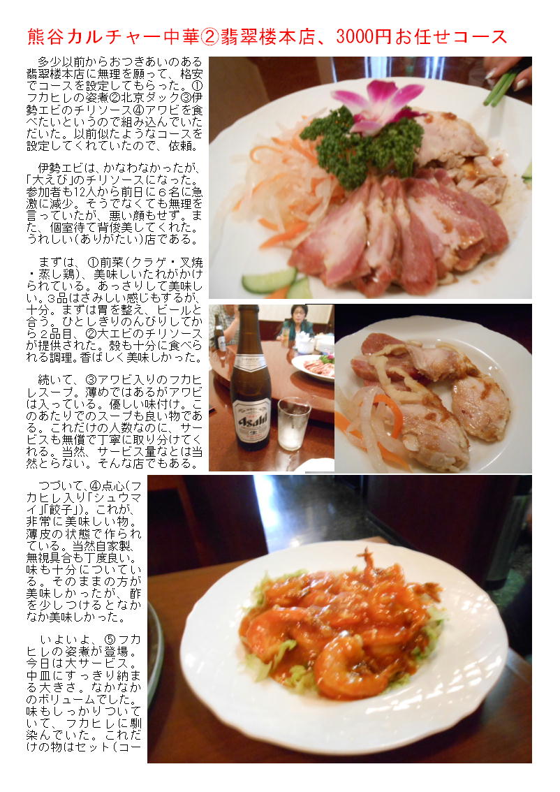 多少以前からおつきあいのある翡翠楼本店に無理を願って、格安でコースを設定してもらった。①フカヒレの姿煮②北京ダック③伊勢エビのチリソース④アワビを食べたいというので組み込んでいただいた。以前似たようなコースを設定してくれていたので、依頼。