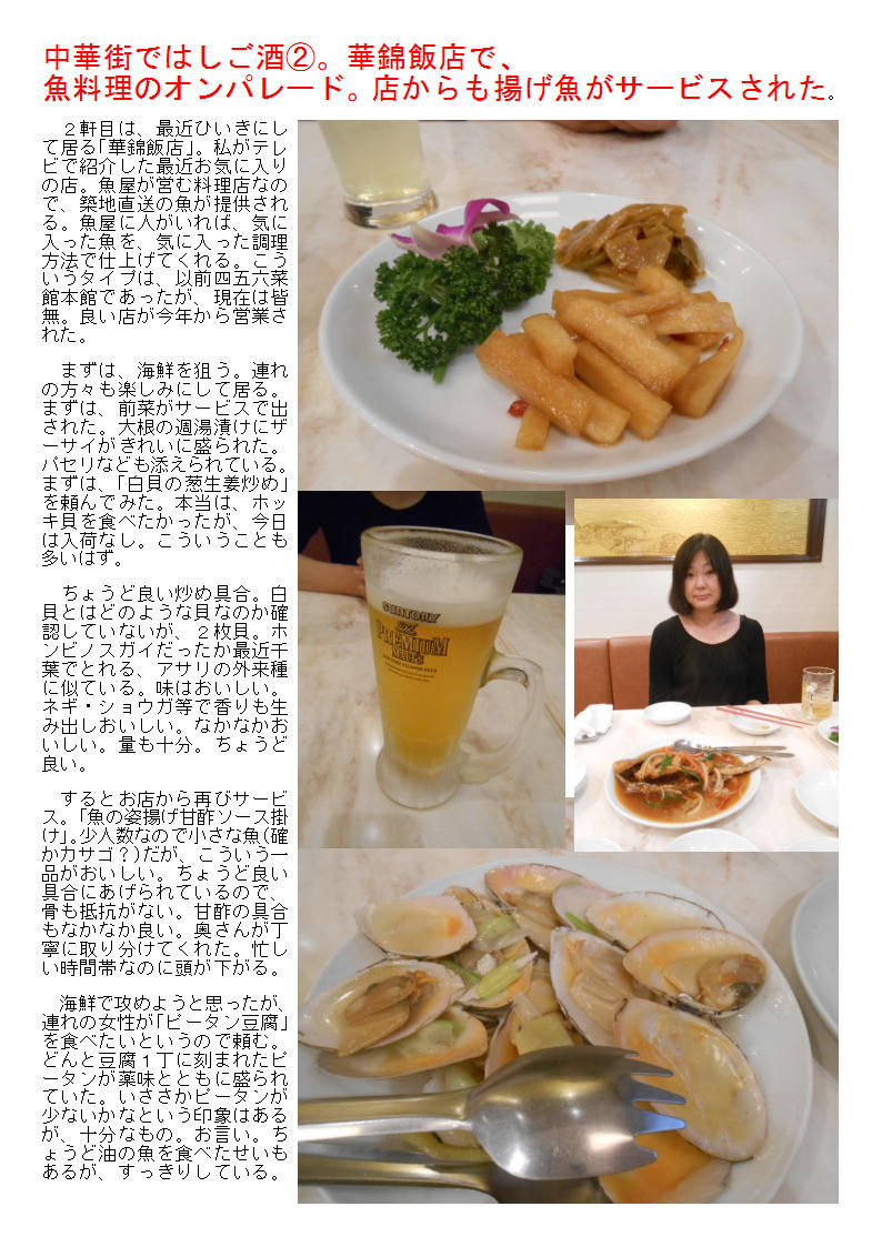 2軒目は、最近ひいきにして居る「華錦飯店」。私がテレビで紹介した最近お気に入りの店。魚屋が営む料理店なので、築地直送の魚が提供される。魚屋に人がいれば、気に入った魚を、気に入った調理方法で仕上げてくれる。こういうタイプは、以前四五六菜館本館であったが、現在は皆無。良い店が今年から営業された。