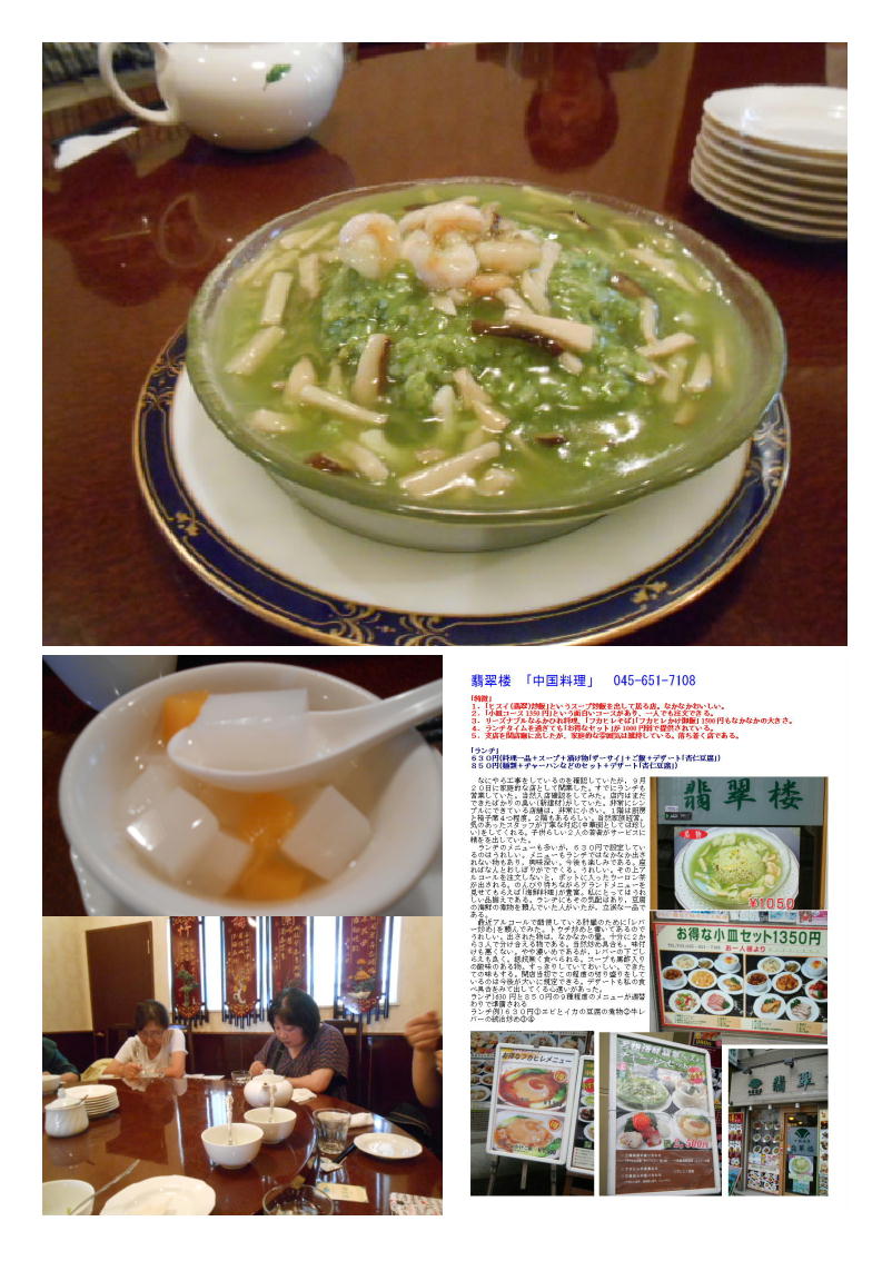 今日はカルチャーセンターの依頼で「中華街」を散策。まずは、中国茶の実際の入れ方を一時間強体験。専門の方に頼み、十分に学習した。お茶は飲んだもののやはり定刻にはおなかがすいてくる。今日はお茶の講習で2000円程度出費し居るので、ランチはランチメニューを数名でシェアする方法で食事とした。