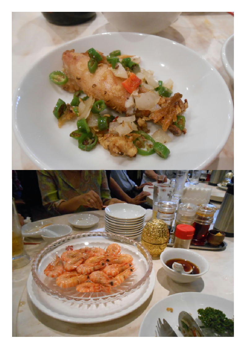 まずは、①前菜(クラゲ・叉焼・蒸し鶏)、美味しいたれがかけられている。あっさりして美味しい。3品はさみしい感じもするが、十分。まずは胃を整え、ビールと合う。ひとしきりのんびりしてから2品目、②大エビのチリソースが提供された。殻も十分に食べられる調理。香ばしく美味しかった。