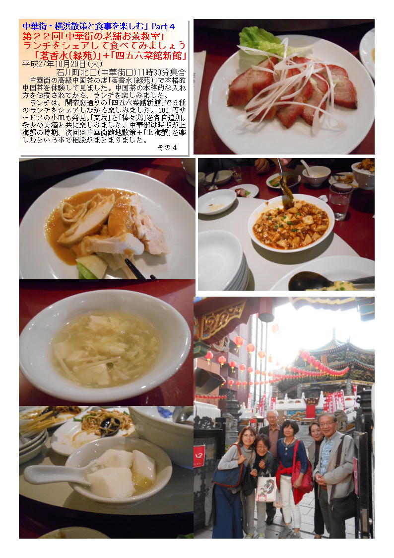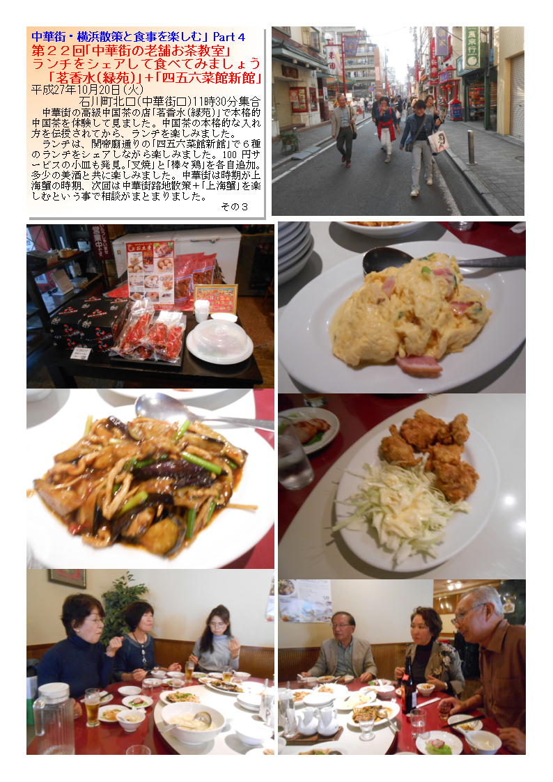 ランチは、関帝廟通りの「四五六菜館新館」で6種のランチをシェアしながら楽しみました。100円サービスの小皿も発見。「叉焼」と「棒々鶏」を各自追加。多少の美酒と共に楽しみました。中華街は時期が上海蟹の時期、次回は中華街路地散策+「上海蟹」を楽しむという事で相談がまとまりました。