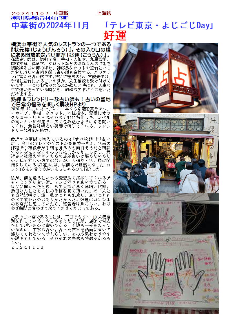 最近の中華街で増えているのは「食べ放題」と「占い店」。今回はテレビのゲストが島田秀平さん。企画の課程で手相役者が手相を見るのも面白そうだと相談するとなんとなくその方向に向かった。しかし、最近占いは増えすぎどちらの店が良いか解らないらしい。私も詳しい方ではないが、大通り・状元楼に間借りしている「好運」には、以前もお世話になった「カレン」さんと言う方がいらっしゃるので紹介した。