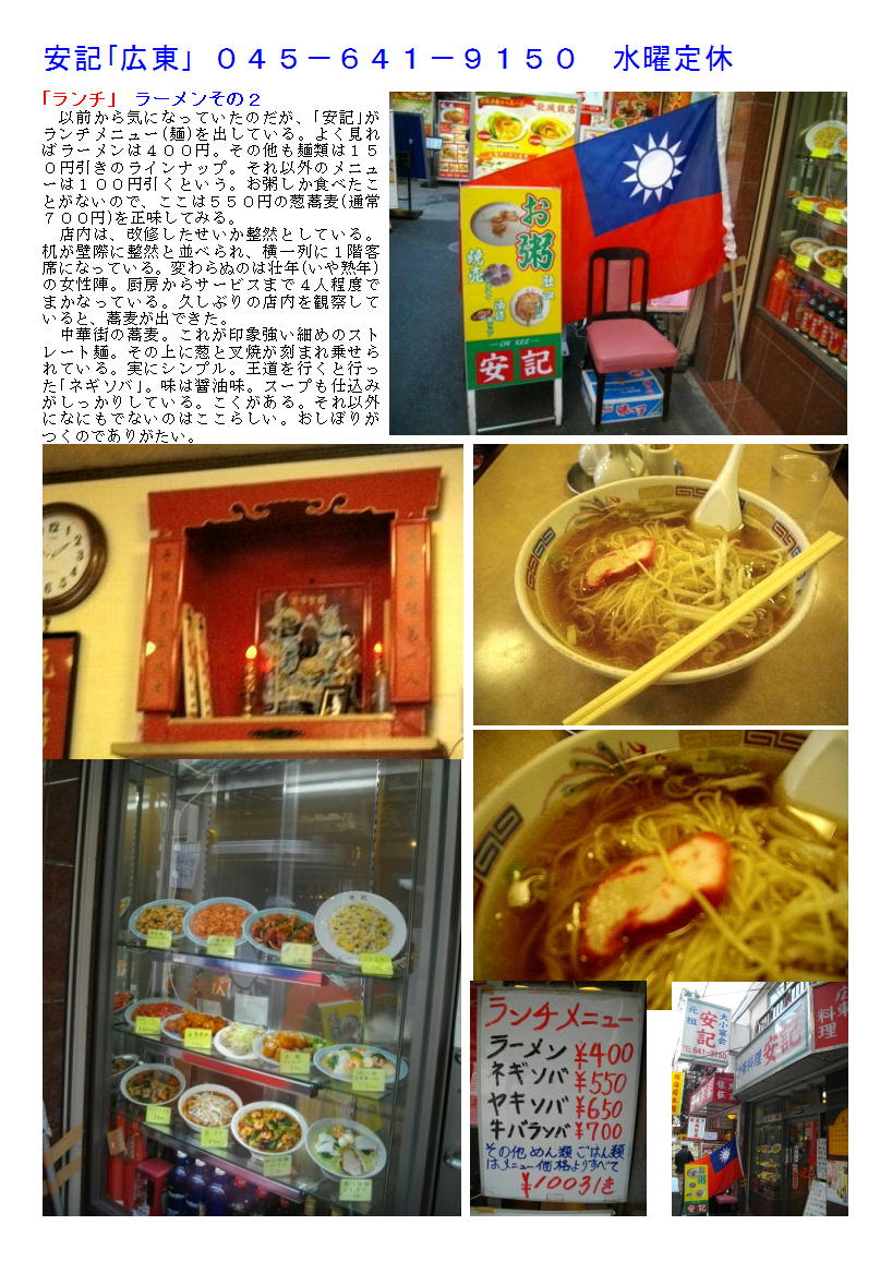 以前から気になっていたのだが、「安記」がランチメニュー(麺)を出している。よく見ればラーメンは400円。その他も麺類は150円引きのラインナップ。それ以外のメニューは100円引くという。お粥しか食べたことがないので、ここは550円の葱蕎麦(通常700円)を正味してみる。