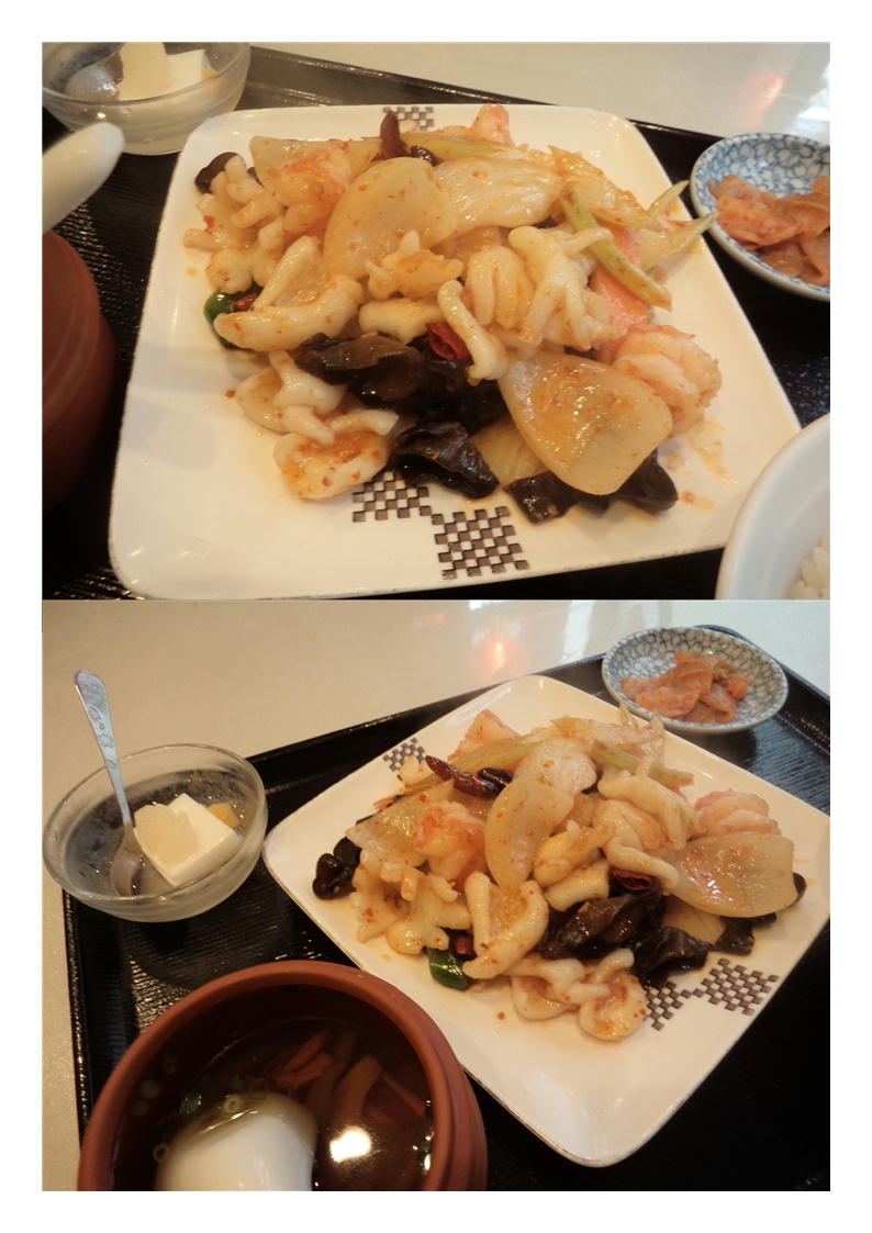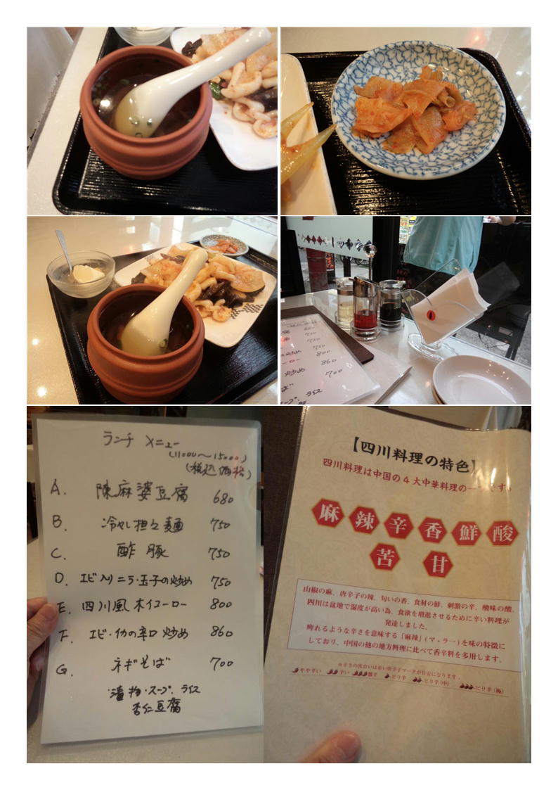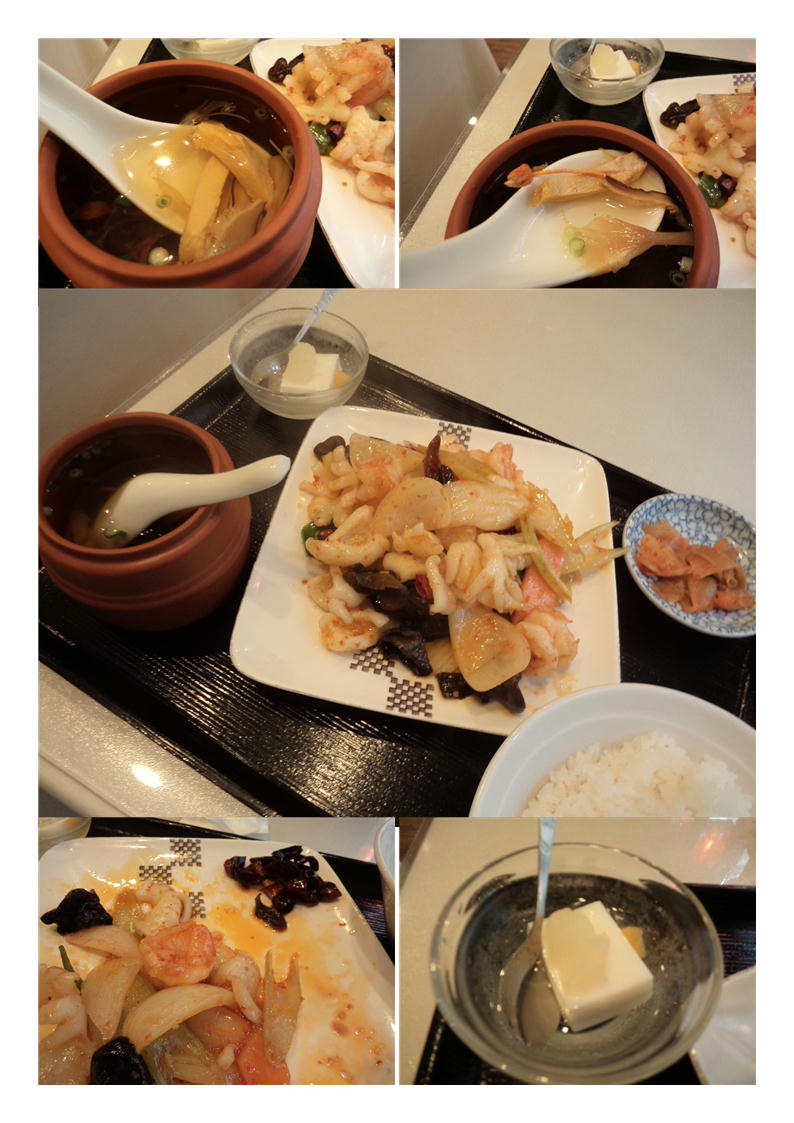 ランチは、①陳麻婆豆腐680円②冷やし坦坦麺750円③酢豚750円④エビ入りにら・玉子炒め750円⑤四川風ホイコーロー⑥エビ・イカの辛口炒め860円⑦ネギソバ700円となっていた。これだけそろうと迷うが、最高価格の「エビ・イカの辛口炒め」としてみた。漬物・スープ・ライス・杏仁豆腐がつくらしい。