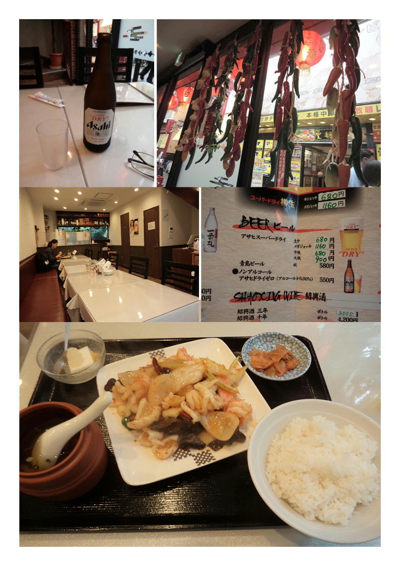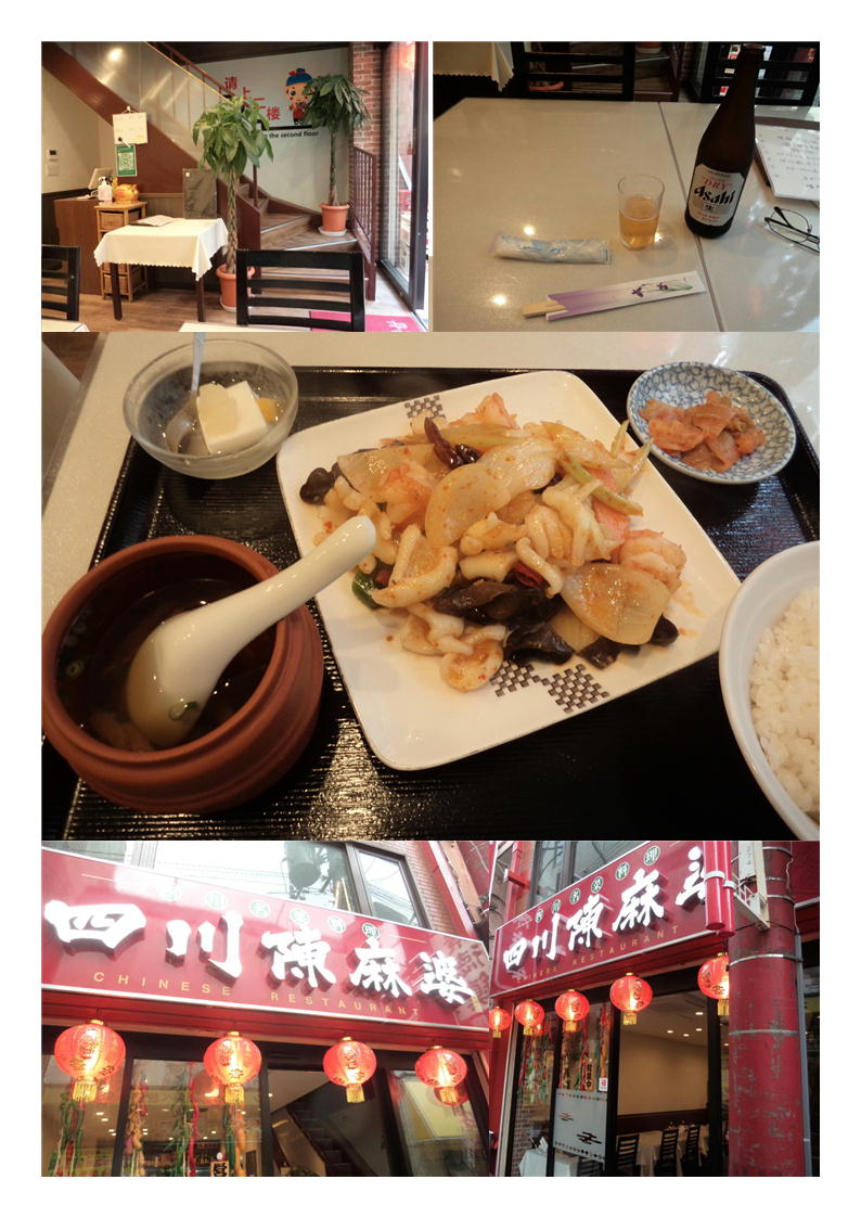 そのあたりでも何か美味しそうな四川料理店ができていた。家族経営らしい店舗は何かアットホーム。聞けば5月に開店したばかりらしい。麻婆豆腐も得意だが、今日のランチでは「海老・イカの辛口炒め」がお薦めだと言うので食べてみることにした。今日は、仕事後の入店、ビールも飲むことにした。かなり飲み物は高い、生ビールで680円。中瓶も680円なので瓶ビールとした。手書きのメニューも親近感があるが、なかなか良い雰囲気の店だった。食べて見ればなかなか美味しい。