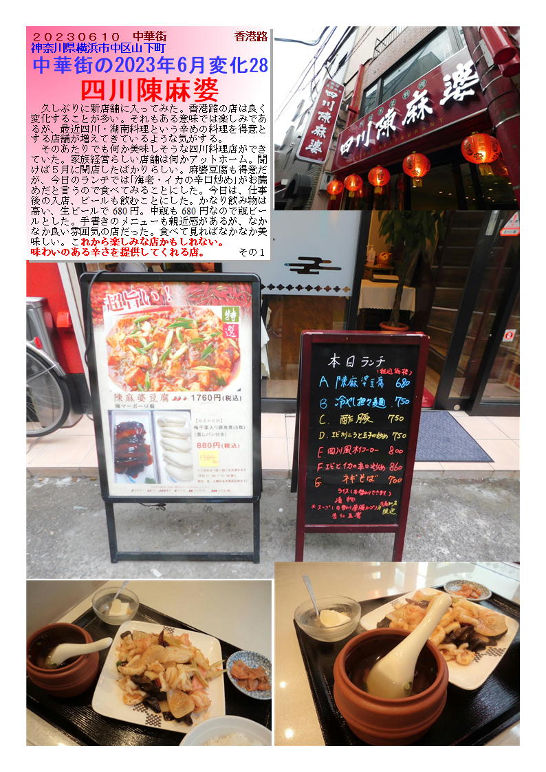 そのあたりでも何か美味しそうな四川料理店ができていた。家族経営らしい店舗は何かアットホーム。聞けば5月に開店したばかりらしい。麻婆豆腐も得意だが、今日のランチでは「海老・イカの辛口炒め」がお薦めだと言うので食べてみることにした。今日は、仕事後の入店、ビールも飲むことにした。かなり飲み物は高い、生ビールで680円。中瓶も680円なので瓶ビールとした。手書きのメニューも親近感があるが、なかなか良い雰囲気の店だった。食べて見ればなかなか美味しい。これから楽しみな店かもしれない。