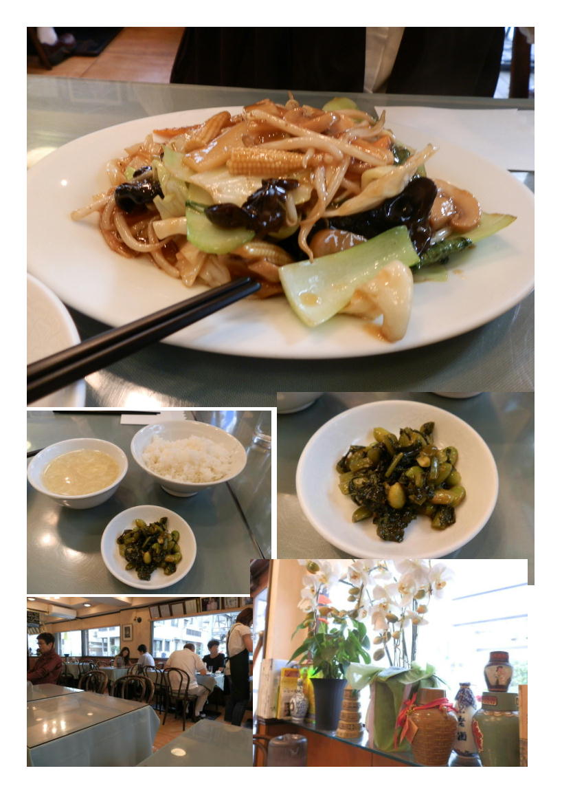 その中から、炒素什景(五目季節野菜炒め)を頼んで見る。まずは、御飯・スープ・香の物が出される。今日は「玉子スープ」「中国高菜と枝豆の炒め物」。なかなかおいしい。高菜の和え物は多少ごま油、ピリ辛味。これだけでも御飯が進む。