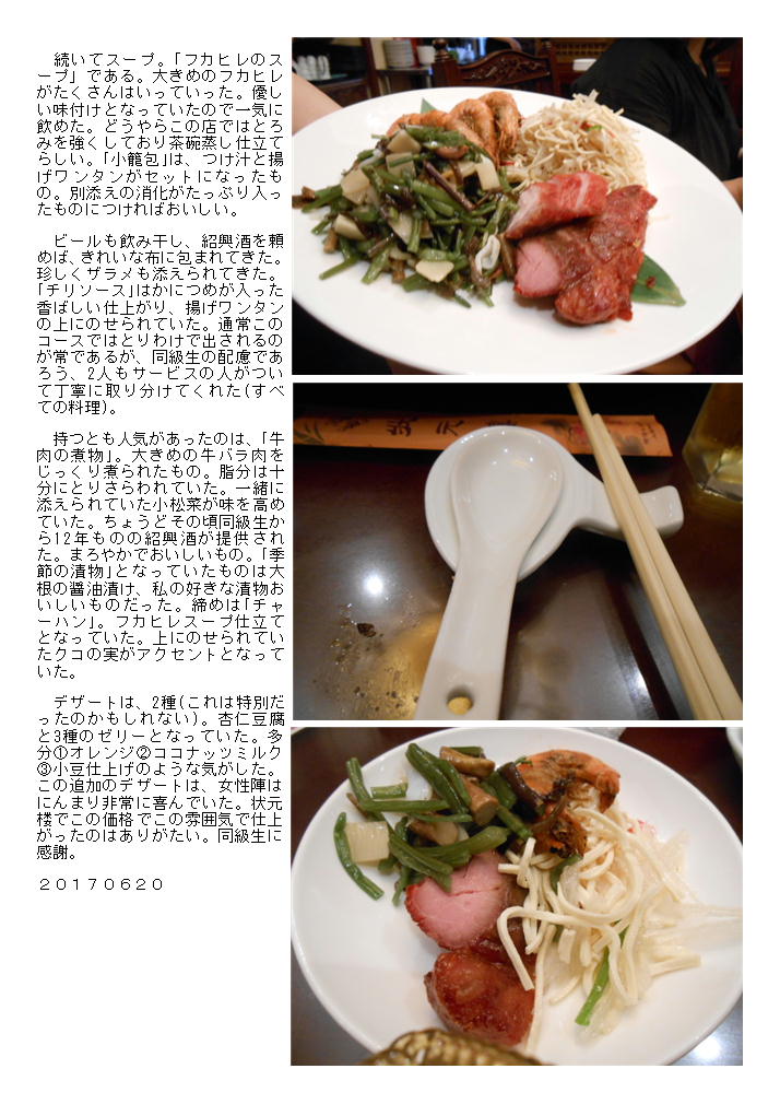 持つとも人気があったのは、「牛肉の煮物」。大きめの牛バラ肉をじっくり煮られたもの。脂分は十分にとりさらわれていた。一緒に添えられていた小松菜が味を高めていた。ちょうどその頃同級生から12年ものの紹興酒が提供された。まろやかでおいしいもの。「季節の漬物」となっていたものは大根の醤油漬け、私の好きな漬物おいしいものだった。締めは「チャーハン」。フカヒレスープ仕立てとなっていた。上にのせられていたクコの実がアクセントとなっていた。