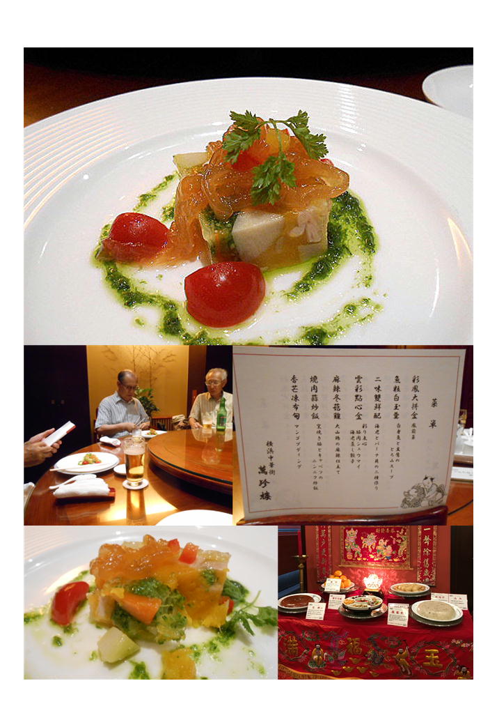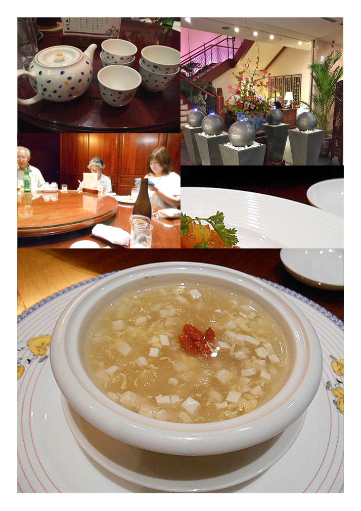 入り口のホールで黒服の女性に伝えれば、すくに3階の個室に案内された。6人であるがちょうど良い大きさに区切ってくれていた。「鳳前菜」は、やや洋風のもの。食べれば、中華にこごり。そのスープがきれいに盛り付けされていた。彩りよくまとめられており、この時点で参加者は満足していた。