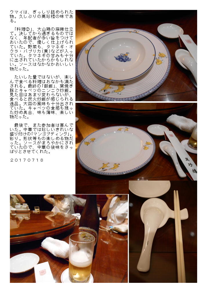 「料理②」、大山鶏の麻辣仕立て。決してから過ぎるものではなく、年配者が多い旨をつけておいたので、優しく仕上げられていた。野菜も、タマネギ・オクラ・パプリカ(黄)などが入っていた。タマネギの甘みも十分に出されていたからかもしれない。ソースはなかなかおいしい物だった。