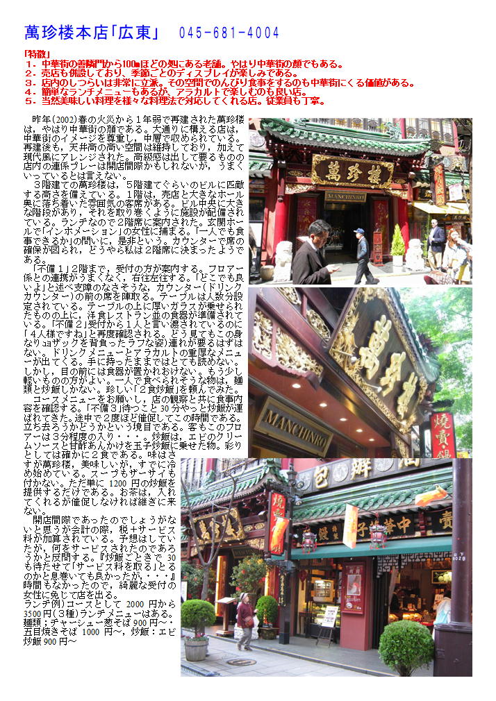 昨年(2002)春の火災から1年弱で再建された萬珍楼は,やはり中華街の顔である。大通りに構える店は,中華街のイメージを尊重し,中層で収められている。再建後も,天井高の高い空間は維持しており,加えて現代風にアレンジされた。高級感は出して要るものの店内の連係プレーは開店間際かもしれないが,うまくいっているとは言えない。