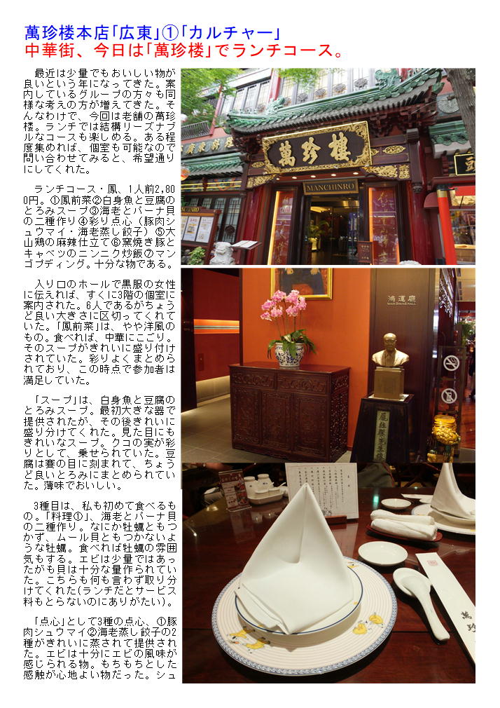 最近は少量でもおいしい物が良いという年になってきた。案内しているグループの方々も同様な考えの方が増えてきた。そんなわけで、今回は老舗の萬珍楼。ランチでは結構リーズナブルなコースも楽しめる。ある程度集めれば、個室も可能なので問い合わせてみると、希望通りにしてくれた。