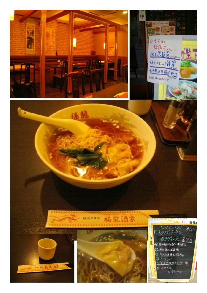 なにか、定食だと井に重く感じることがある。以前はほとんど麺類を食べなかった私であるが、最近は何か中華街で、麺を食べたくなるときがある。ワンコインでどんぶりでもと思い、南門シルクロードを歩けば、「福龍飯店」にたどり着く。なんと今日はどんぶりがない。麺。メニューには「海老入りワンタン麺」となっている。こうなると興味がわく。
