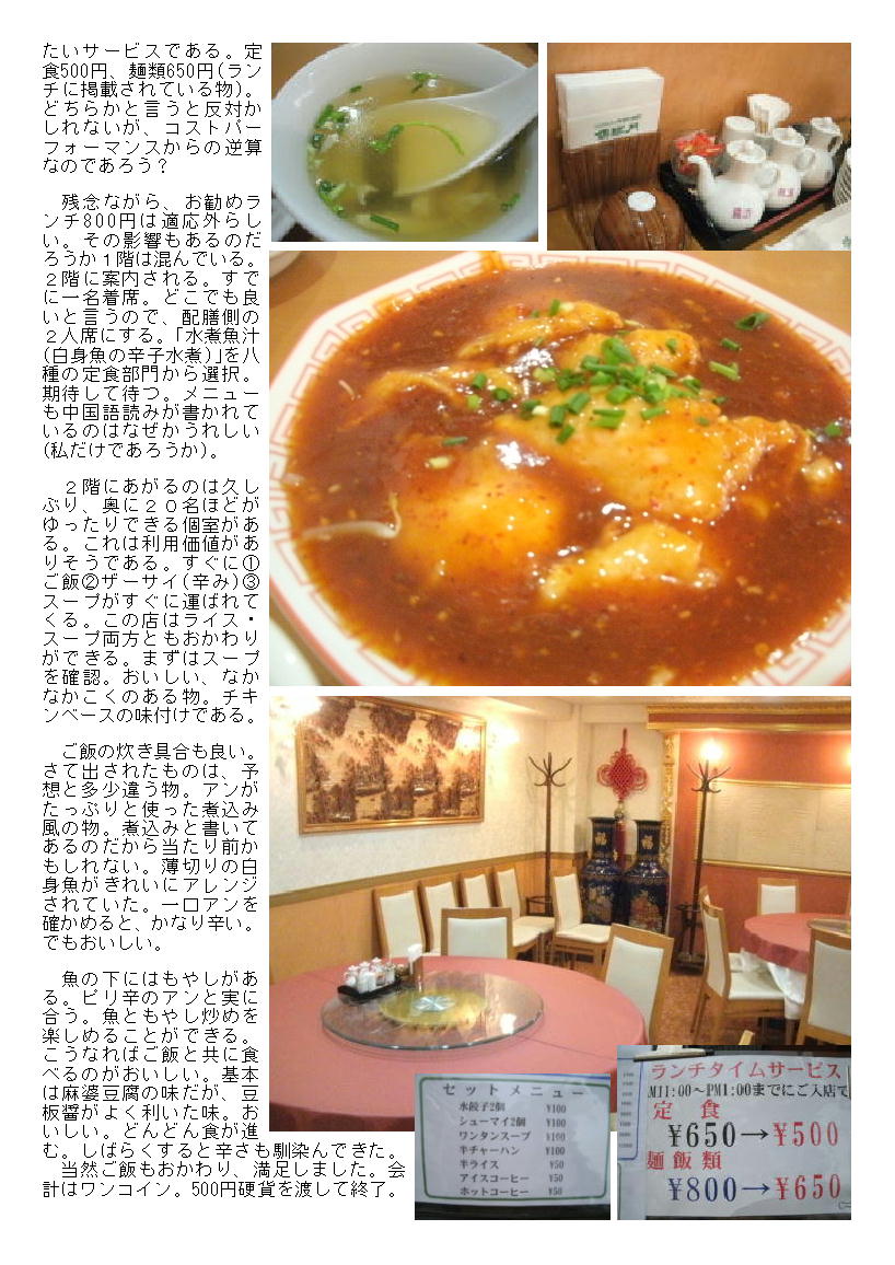 残念ながら、お勧めランチ800円は適応外らしい。その影響もあるのだろうか1階は混んでいる。2階に案内される。すでに一名着席。どこでも良いと言うので、配膳側の2人席にする。「水煮魚汁(白身魚の辛子水煮)」を八種の定食部門から選択。期待して待つ。メニューも中国語読みが書かれているのはなぜかうれしい(私だけであろうか)。