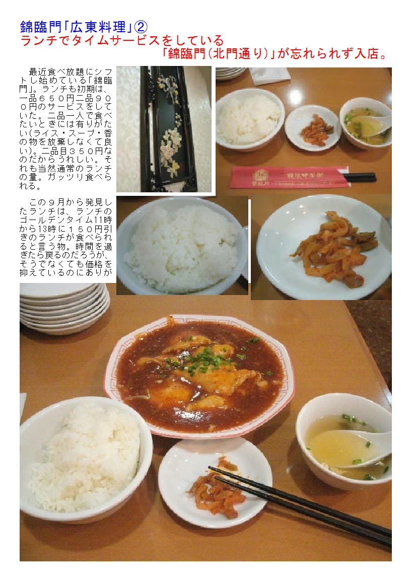 最近食べ放題にシフトし始めている「錦臨門」。ランチも初期は、一品650円二品900円のサービスをしていた。二品一人で食べたいときには有りがたい(ライス・スープ・香の物を放棄しなくて良い)。二品目350円なのだからうれしい。それも当然通常のランチの量。ガッツリ食べられる。