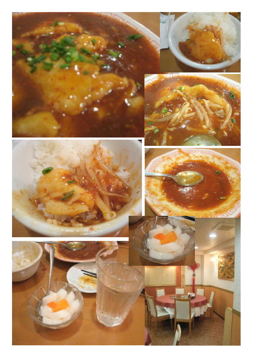 ご飯の炊き具合も良い。さて出されたものは、予想と多少違う物。アンがたっぷりと使った煮込み風の物。煮込みと書いてあるのだから当たり前かもしれない。薄切りの白身魚がきれいにアレンジされていた。一口アンを確かめると、かなり辛い。でもおいしい。