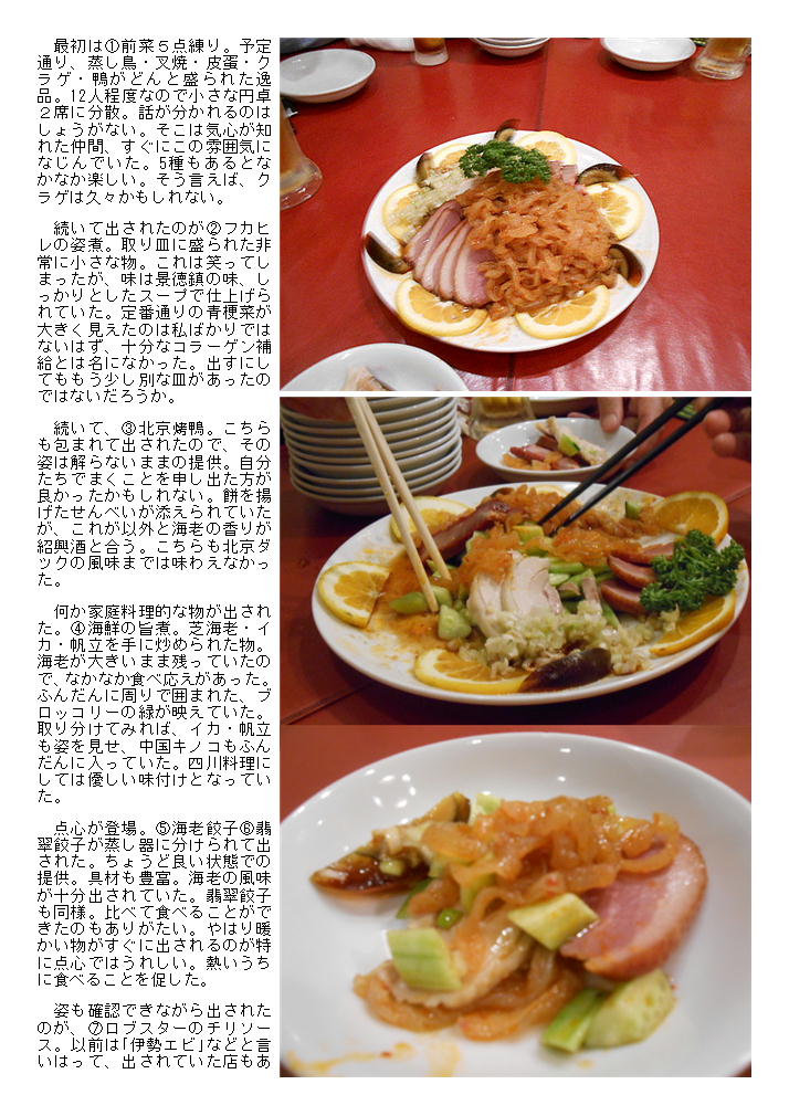 最初は①前菜5点練り。予定通り、蒸し鳥・叉焼・皮蛋・クラゲ・鴨がどんと盛られた逸品。12人程度なので小さな円卓2席に分散。話が分かれるのはしょうがない。そこは気心が知れた仲間、すぐにこの雰囲気になじんでいた。5種もあるとなかなか楽しい。そう言えば、クラゲは久々かもしれない。