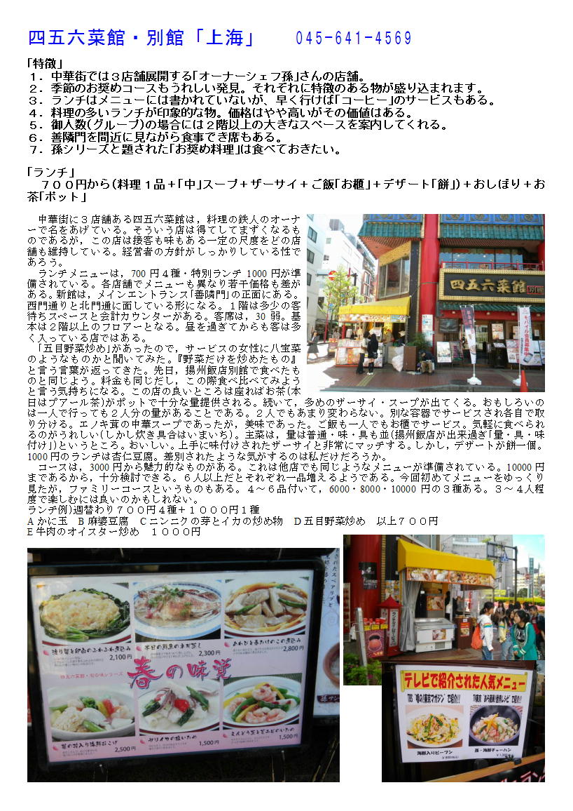 中華街に3店舗ある四五六菜館は,料理の鉄人のオーナーで名をあげている。そういう店は得てしてまずくなるものであるが,この店は接客も味もある一定の尺度をどの店舗も維持している。経営者の方針がしっかりしている性であろう。