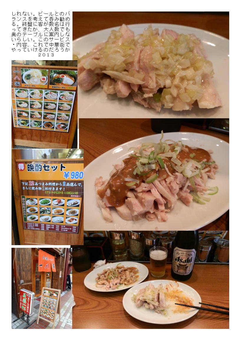 今日は暑かったので、おいしい。しばらくして料理が出された。量は非常に少ない。これが単品で450円では頼まないであろうという代物。まあサービスの一環と思い我慢する。蒸し鶏は、味付けを施された刻み葱がたっぷりかけられた物。つまみとしては丁度良い感じ。麦酒に合う。