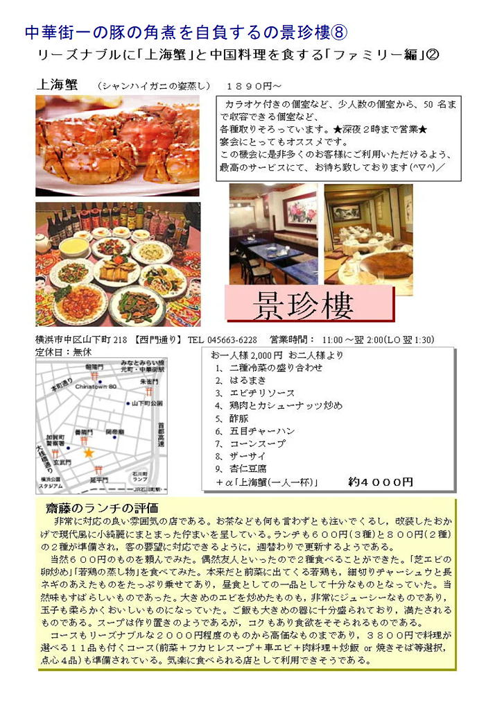 最近中華街の店舗も○○料理として明快に打ち出す店舗が少なくなってきている。したがって店の紹介(hp)等でも中国料理、数社の料理を提供するような表示が多い。でも食べてみればそこに所属する調理人の手腕は修行した場所、育った場所が軽快にでで来るので楽しみである。