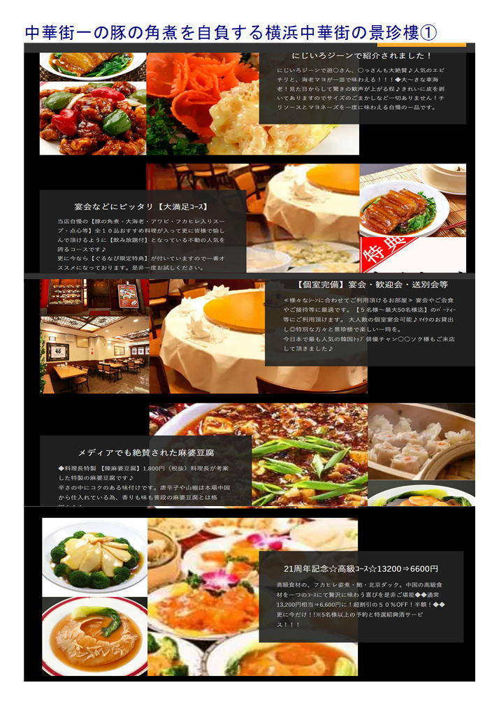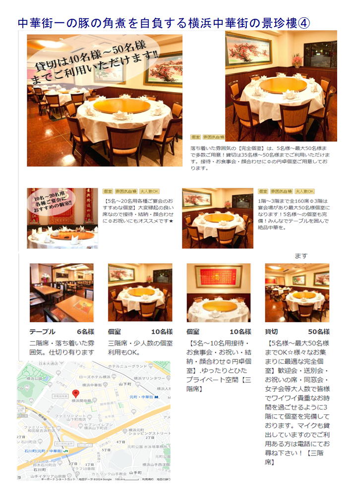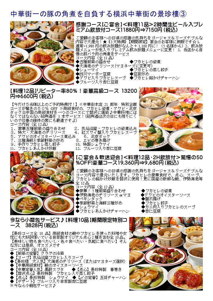 中華街では珍しい深夜二時までという嬉しい営業時間♪♪仕事帰りのコックさんや地元の方々が集まるお店としても知られテレビ、雑誌、地元新聞にも数々紹介されました。家族で落ち着いてお食事や仲間とみんなでワイワイなど、それぞれに合わせて個室料を無料で提供させております。また景珍楼各店では年末年始に向け、忘年会、新年会をはじめ各種のお集りに相応しいメニューを多数ご用意し、皆様のご来店を心からお待ちしております!!