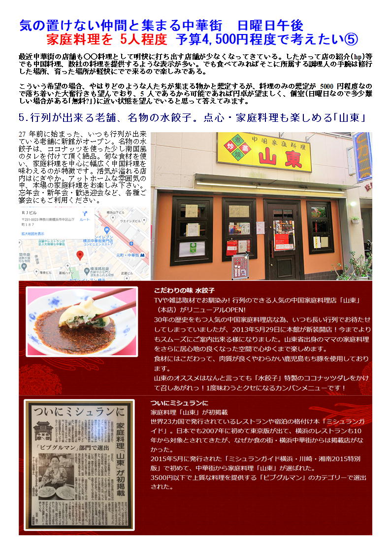 こういう希望の場合、やはりどのような人たちが集まる物かと想定するが、料理のみの想定が5000円程度なので落ち着いた大奮行きも望んでおり、5人であるから可能であれば円卓が望ましく、個室(日曜日なので多少難しい場合がある「無料?」)に近い状態を望んでいると思って答えてみます。いろいろなhpから引用してます。
