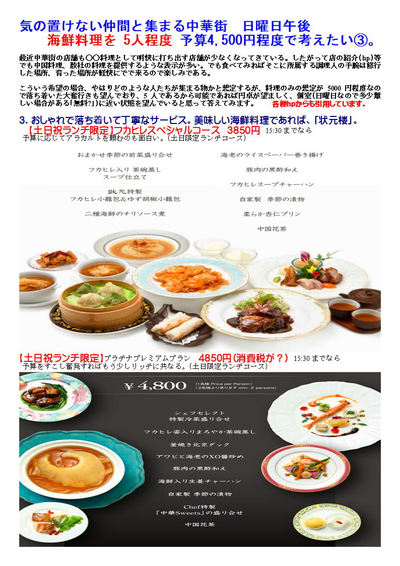 こういう希望の場合、やはりどのような人たちが集まる物かと想定するが、料理のみの想定が5000円程度なので落ち着いた大奮行きも望んでおり、5人であるから可能であれば円卓が望ましく、個室(日曜日なので多少難しい場合がある「無料?」)に近い状態を望んでいると思って答えてみます。