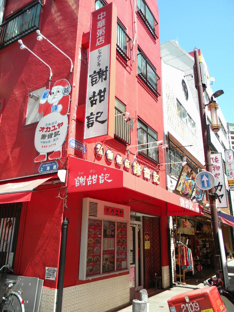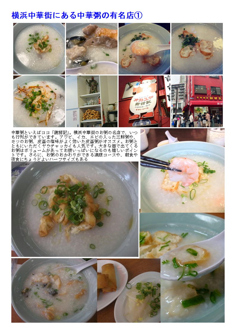 店に行けば,テーブルには皿に醤油が入れられ葱がレンゲと共に準備される。当然店の方もお粥を食べることを基本的に想定している。安記などの古参の店もあるが,現在の中華街でお粥といえば謝甜記であろう。すぐ近くの上海路に「謝甜記弐号店」があり,カジュアルな雰囲気でお粥が食べることもできる。