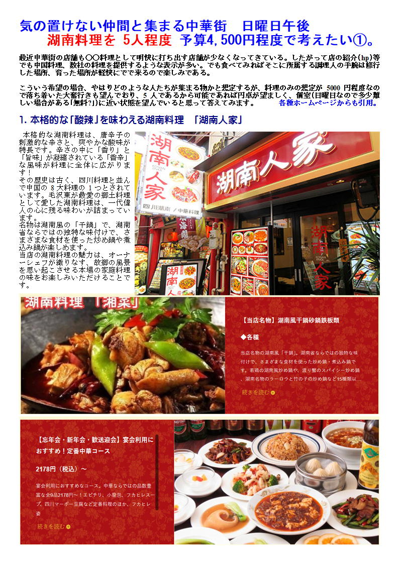 湖南料理を 午後5人程度 予算4,500円程度で考えたい。
