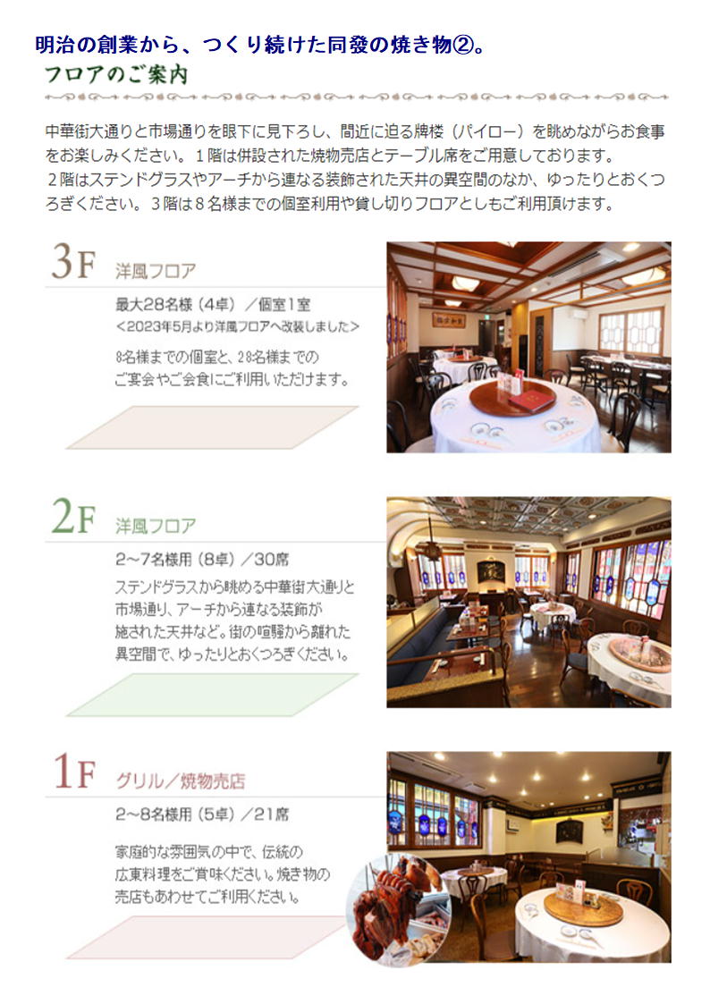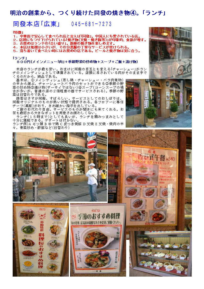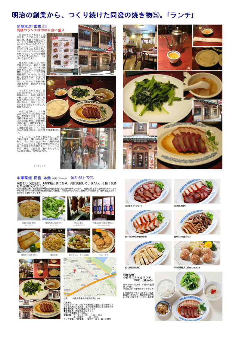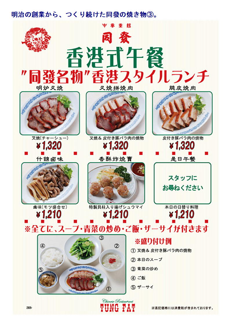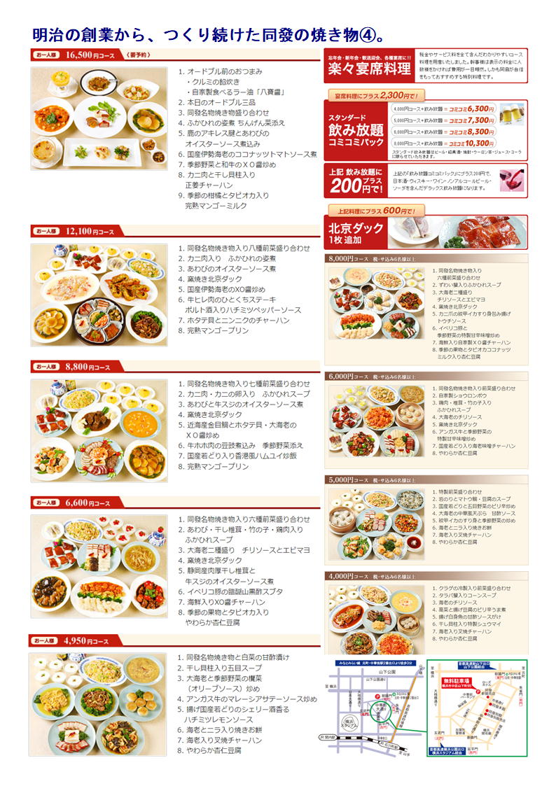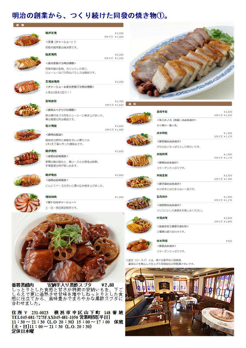 中華菜館 同發は焼き物を中心とする食材店として明治に創業。 以来、本場・中国の味にこだわり続ける本格広東料理の数々を提供しております。 豚・牛・鶏・家鴨などの厳選素材に「風味」と「香味」を加え焼きあげた秘伝の焼き物をご堪能ください。 温かなもてなしと懐かしい雰囲気で、世代を超えた多くのファンに愛されています。 中華街大通りに隣接する大型の専用駐車場をご利用ください。 同發という店名は、「お客様と共にあり、共に発展していきたい」と願う気持ちから付けられました。