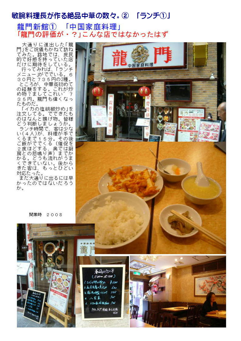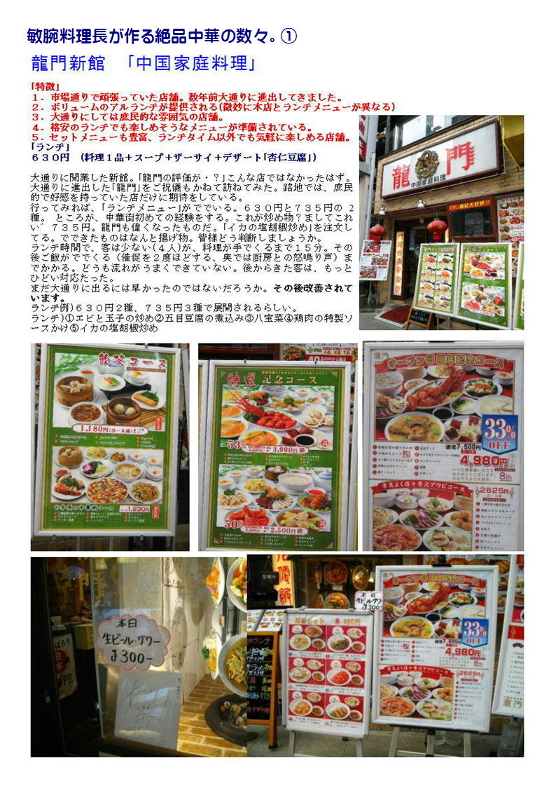 最近中華街の店舗も○○料理として明快に打ち出す店舗が少なくなってきている。したがって店の紹介(hp)等でも中国料理、数社の料理を提供するような表示が多い。でも食べてみればそこに所属する調理人の手腕は修行した場所、育った場所が軽快にでで来るので楽しみである。