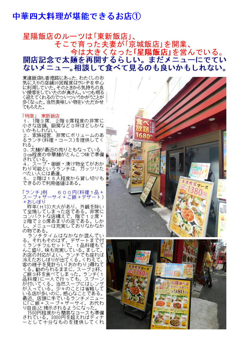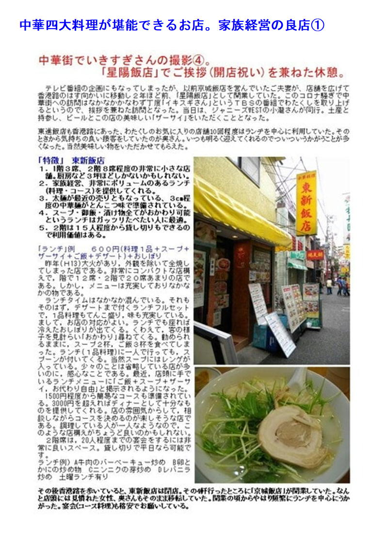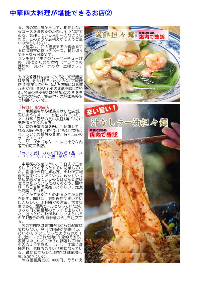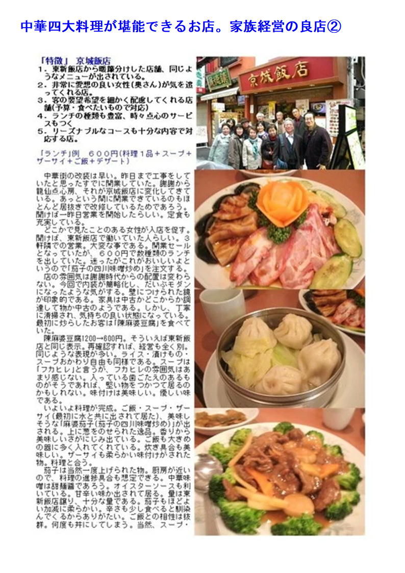 最近中華街の店舗も○○料理として明快に打ち出す店舗が少なくなってきている。したがって店の紹介(hp)等でも中国料理、数社の料理を提供するような表示が多い。でも食べてみればそこに所属する調理人の手腕は修行した場所、育った場所が軽快にでで来るので楽しみである。