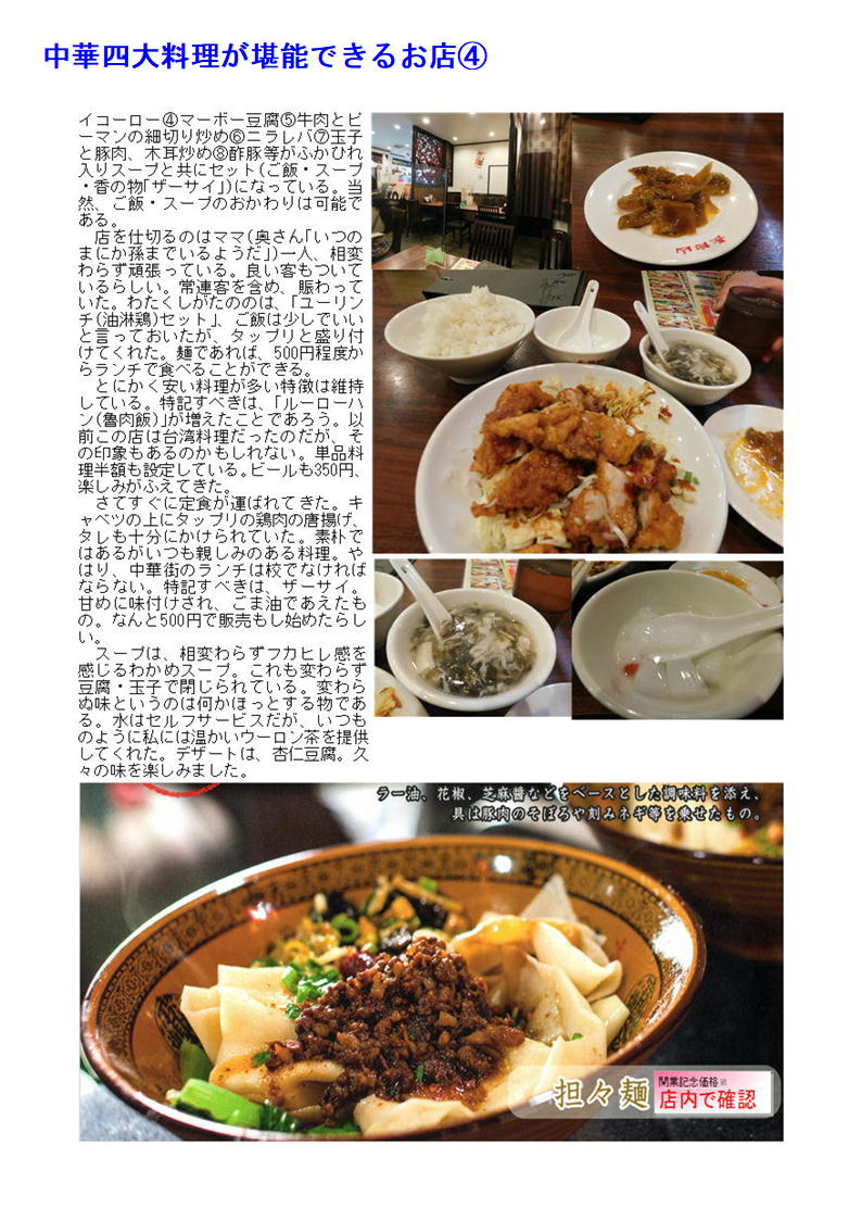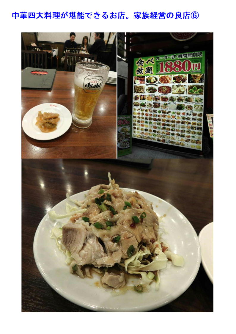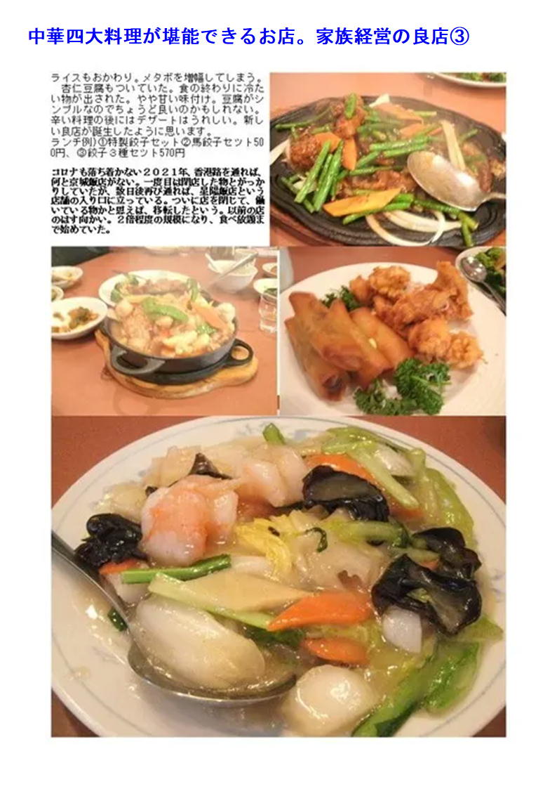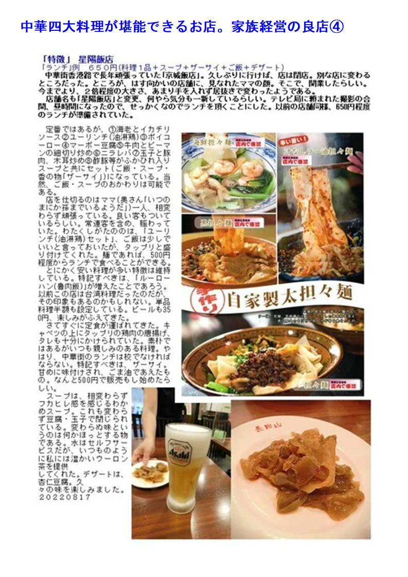 最近中華街の店舗も○○料理として明快に打ち出す店舗が少なくなってきている。したがって店の紹介(hp)等でも中国料理、数社の料理を提供するような表示が多い。でも食べてみればそこに所属する調理人の手腕は修行した場所、育った場所が軽快にでで来るので楽しみである。